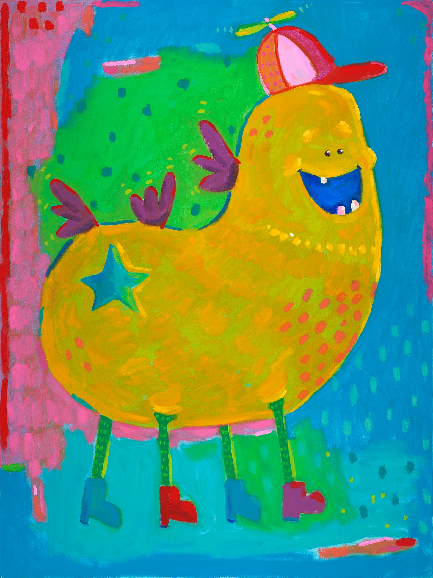 A few things about the book that I haven’t shared before… when I started painting the aliens, I knew I was complete at 16. But, I needed more illustrations to fill the pages that had only text. So instead of painting more, I took close up pictures of certain parts of the paintings instead. Now every page is super colorful, and if you look closely you can match the background to a specific spot on the alien. The quote above goes with the alien Chairo (aka Big Yellow), who was created specifically for one of my early investors (thank you, friend, you are a gift!). Here’s Chairo…