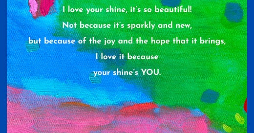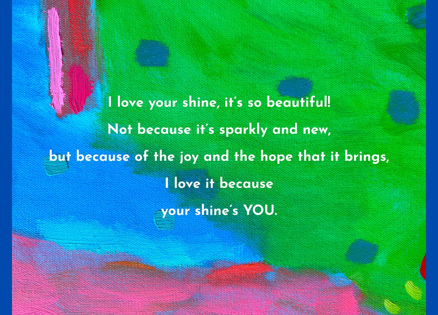 “I love your shine. It’s SO beautiful! Not because it’s shiny and new, but because of the joy and the hope that it brings. I love it because your shine is YOU. Now go share your beautiful shine!”